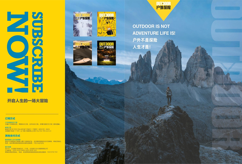 雜志是一本以專業(yè)性、實(shí)用性和趣味性為主導(dǎo)的戶外探險(xiǎn)雜志,為讀者提供全面、準(zhǔn)確、實(shí)用的戶外探險(xiǎn)信息和建議,鼓勵(lì)讀者走出家門,探索自然,挑戰(zhàn)自我,推崇積極健康的生活方式。無(wú)論您是戶外探險(xiǎn)愛好者還是專業(yè)人士,雜志都是您不可或缺的參考和指導(dǎo)。